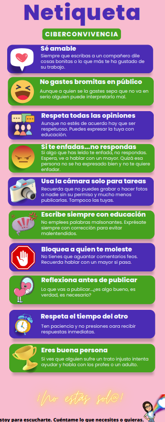 Aprende las reglas esenciales de convivencia en el entorno digital con nuestra Guía de Netiqueta. Enseña a los más pequeños a interactuar con respeto, amabilidad y responsabilidad en línea. Esta información está ampliada en nuestro blog, donde exploramos más detalles sobre cómo fomentar una ciberconvivencia saludable.